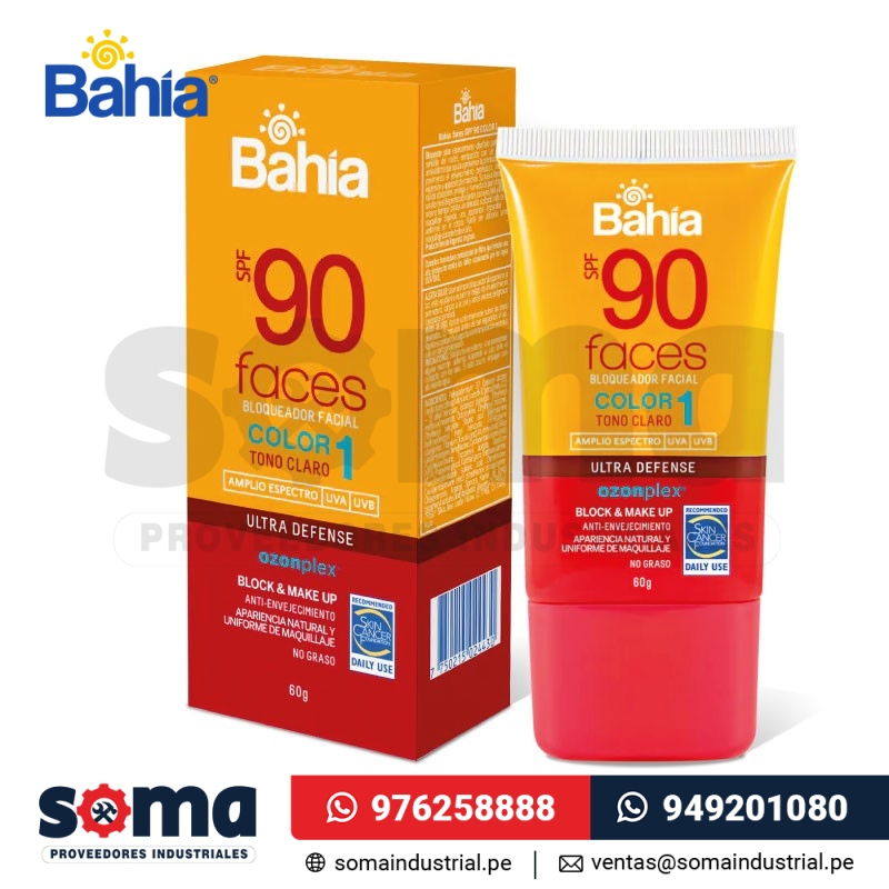 El bloqueador solar Bahia SPF 90 Color 1 de 60 g está formulado para ofrecer una alta protección contra los rayos UVA y UVB, especialmente diseñado para la piel sensible del rostro. Enriquecido con antioxidantes, previene el envejecimiento prematuro y ofrece un acabado natural y uniforme, ideal para ser utilizado como maquillaje durante todo el año.